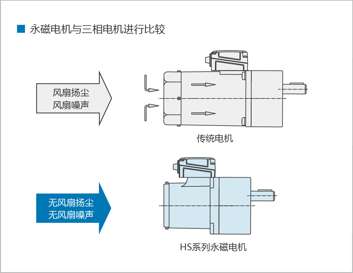 無風扇揚塵因為使用的是高效率電機,電機發熱小,電機無需散熱風扇、無揚塵。