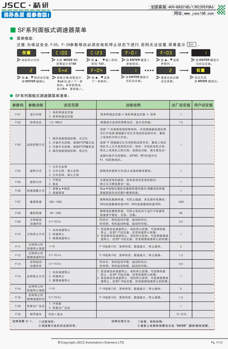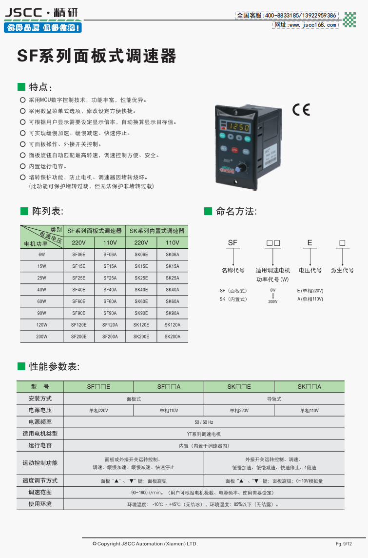 精研電機(jī)始終秉承“精益求精,研發(fā)創(chuàng)新”的理念為客戶提供優(yōu)質(zhì)可靠的產(chǎn)品。 SF系列面板式調(diào)速器是SPC系列調(diào)速器的升級版,在外觀上SF系列使用數(shù)顯菜單,修改設(shè)定方便快捷。而在功能上,新增的緩慢加速,緩慢減速等功能能幫助客戶實(shí)現(xiàn)更全面的控制。 提示SF系列需要搭配我司YT系列調(diào)速電機(jī)使用,在選購本產(chǎn)品時(shí)請注意。